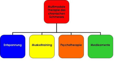 "Multimodal" leitet sich aus dem Lateinischen ab und bedeutet “vielfältig/ vielgestaltig“ und meint die Behandlung eines Betroffenen mit verschiedenen ergänzenden Verfahren, möglichst innerhalb eines abgestimmten Therapiekonzeptes durch ein untereinander vernetztes Behandlerteam, wie es z.B. in einer Schmerz(tages-)klinik oder ambulant in Form einer Behandlung bei einem Facharzt in zeitgleicher Kombination mit einer Schmerzpsychotherapie, Physio- und Trainingstherapie realisiert werden kann.